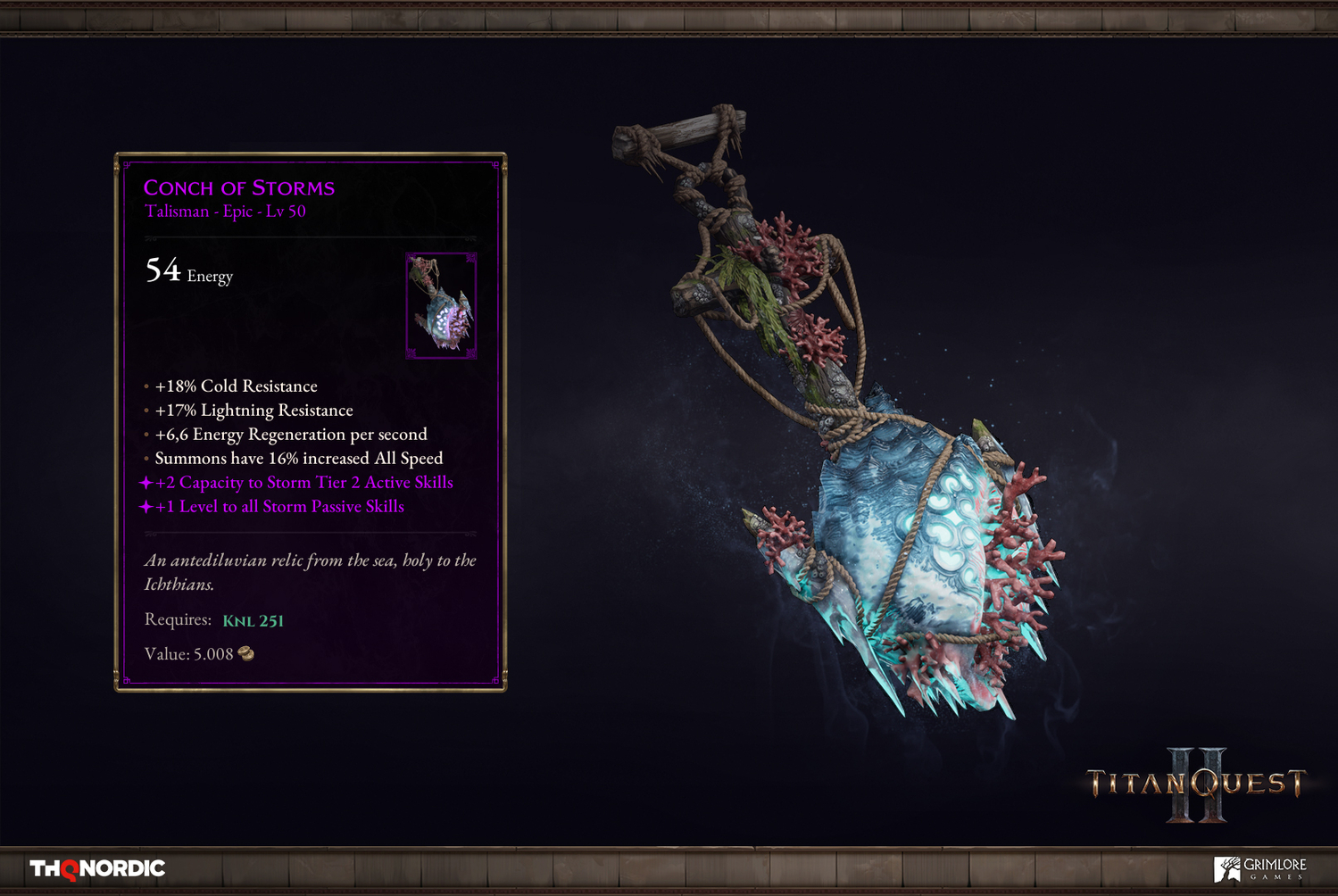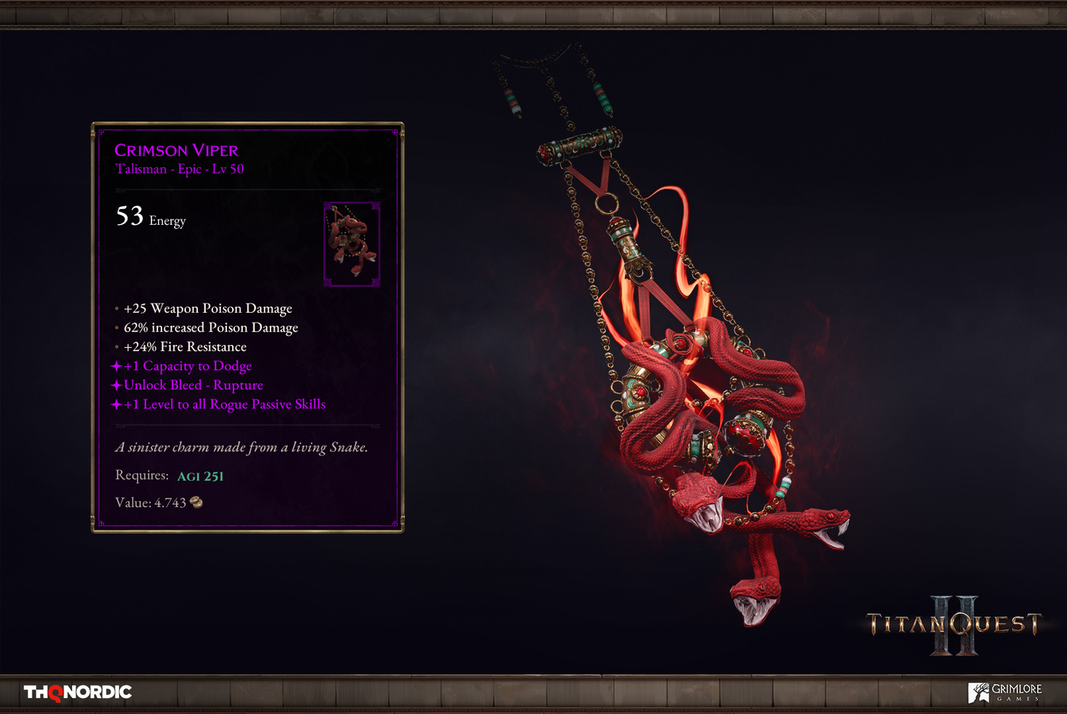 Посмотрите на два примера: «Раковина бурь» и «Багровая гадюка» (вдохновлён артефактом из оригинального Titan Quest):